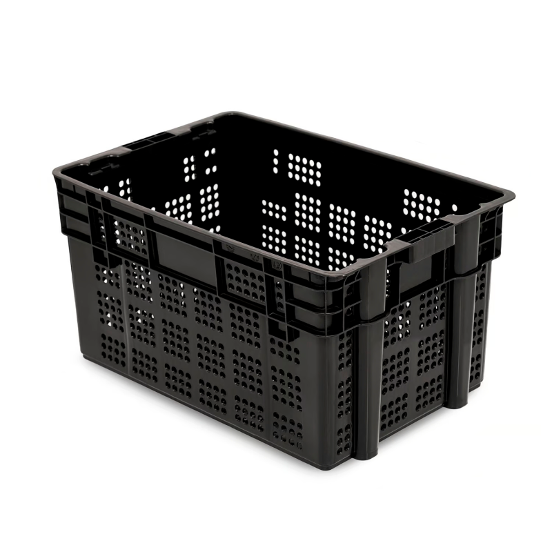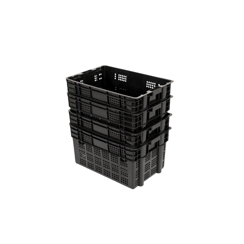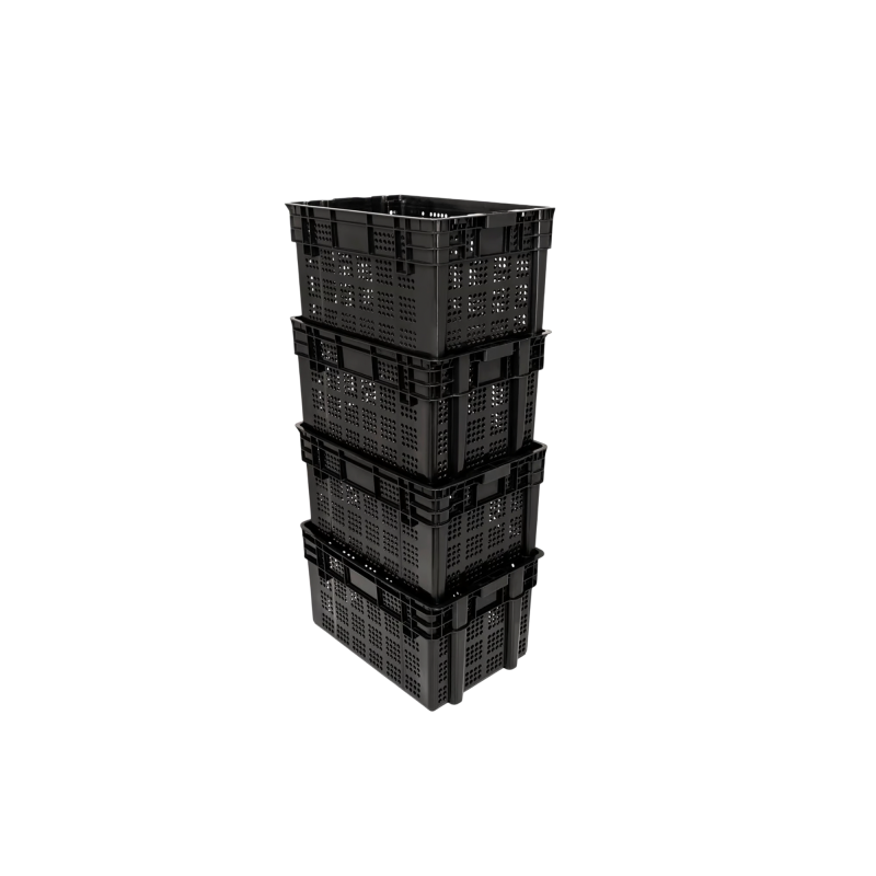 Canastilla apilable y anidable, reduce volumen de almacenamiento.