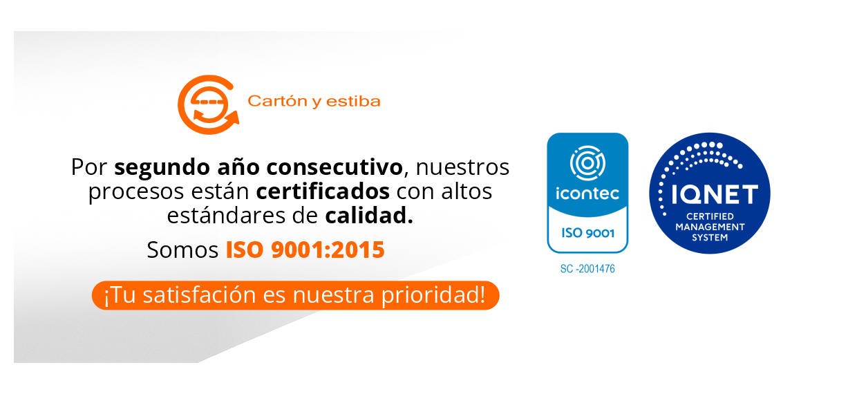 El sistema de calidad NTC - ISO 9001 asegura la calidad y servicio; esta certificación nos permite competir a nivel internacional, ya que ISO 9001 es reconocida en más de 170 países. En Cartón y Estiba, la calidad en nuestros procesos no es solo una promesa, es nuestra manera de trabajar.