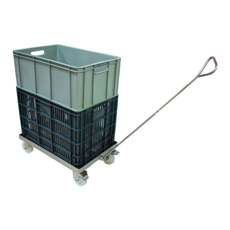Carro con gancho en acero inoxidable 304 grado alimenticio diseñado para el transporte fácil y seguro de canastillas de 60×40