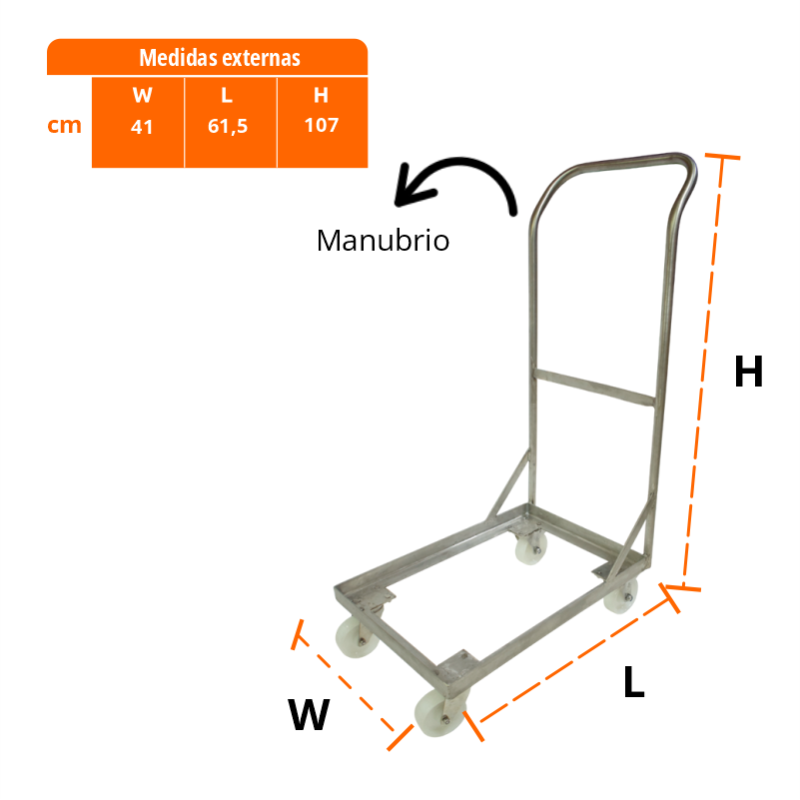 Carro con manubrio en acero inoxidable 304 grado alimenticio diseñado para el transporte fácil y seguro de canastillas de 60×40 cm.