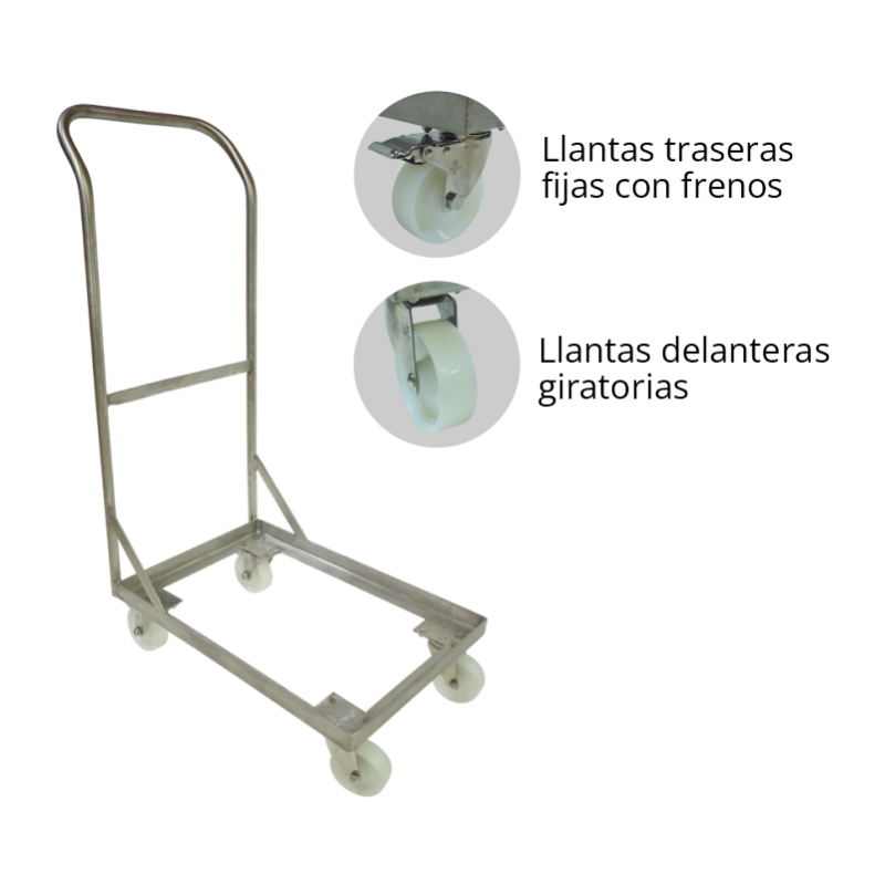 Carro porta canastilla con manubrio. Estructura en acero inoxidable 304 grado alimenticio. Llantas de nylon con un tenedor de acero inoxidable de giro suave muy ajustado con graseras de lubricación.