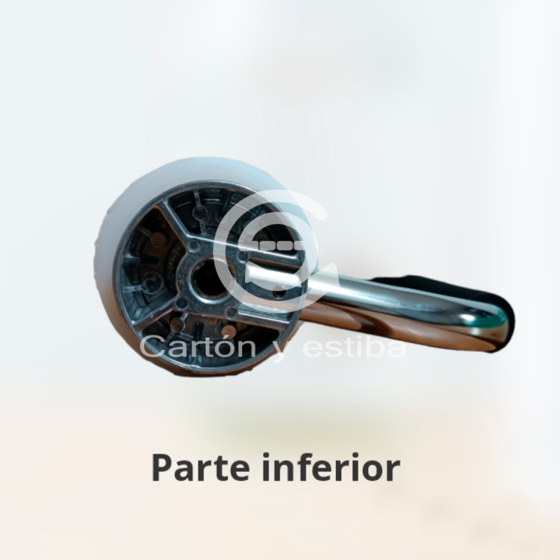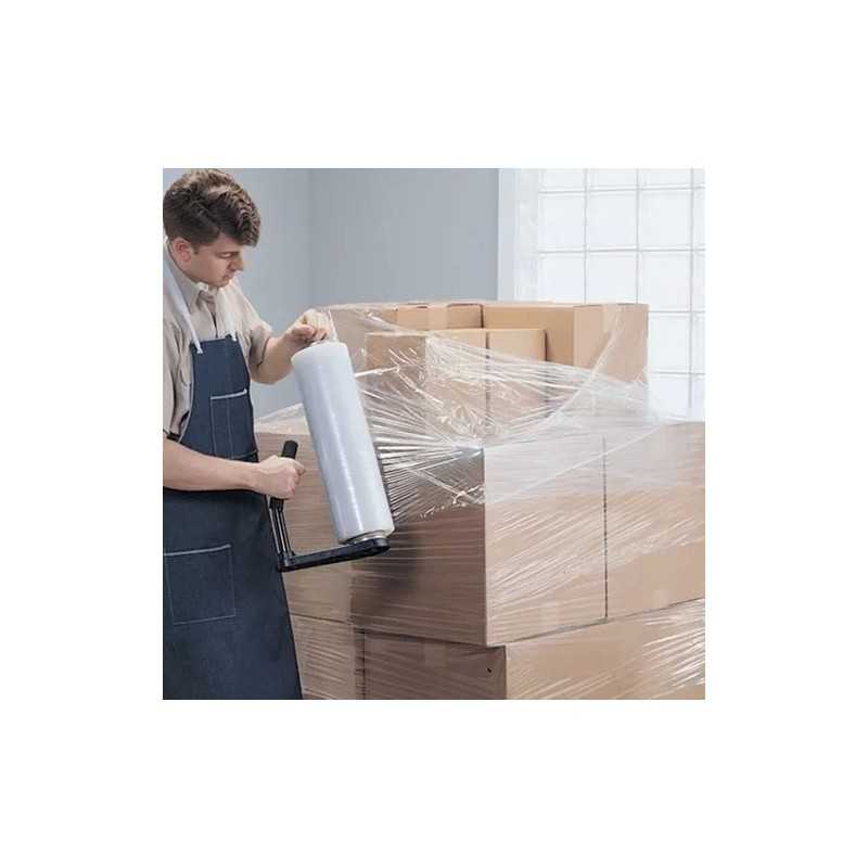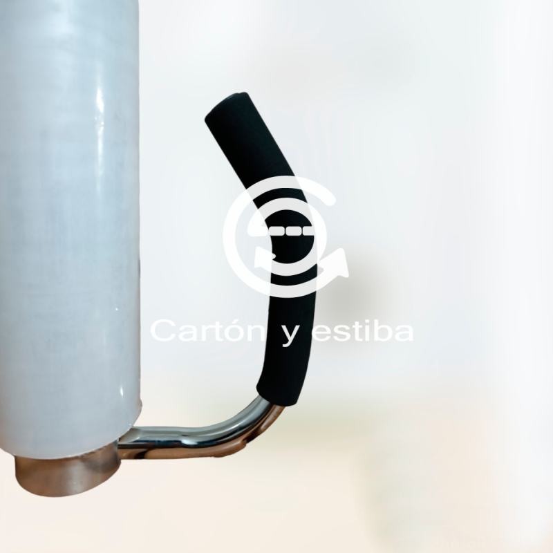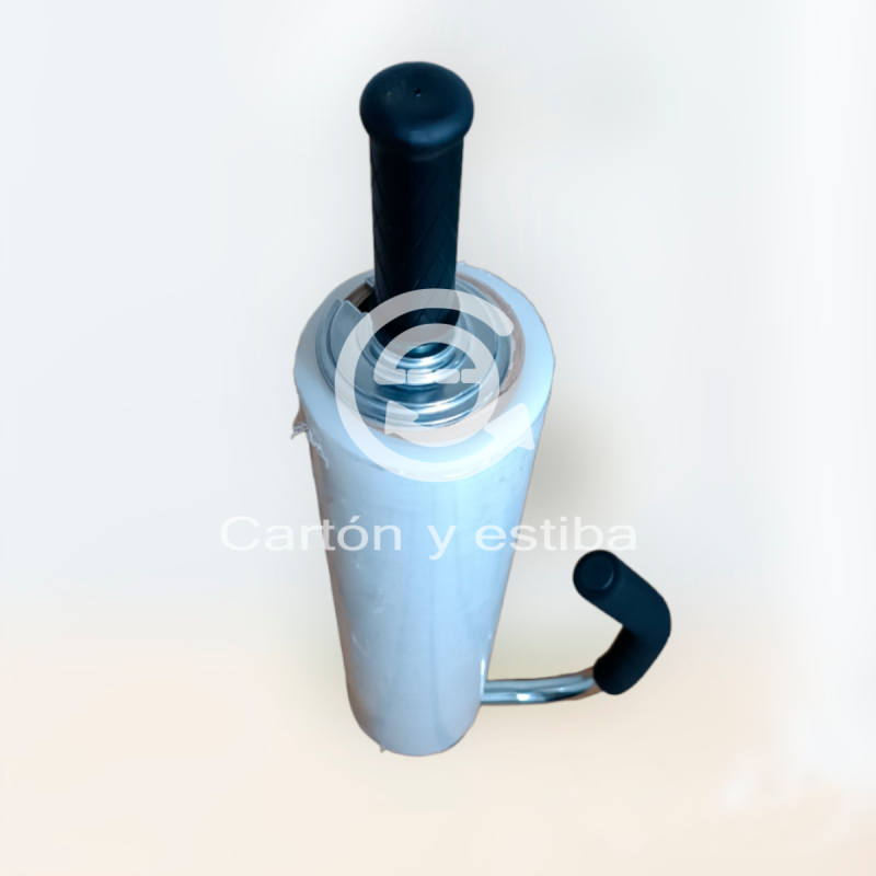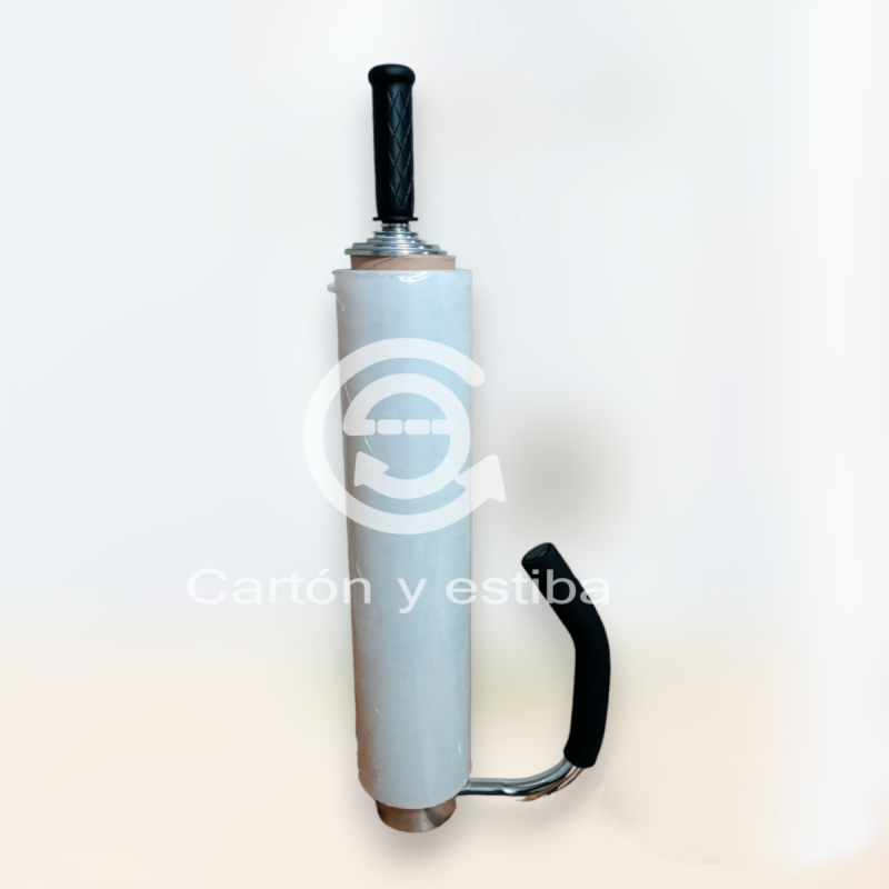 Dispensador de stretch metálico para core de 2″ y 3″, ancho de hasta 50 cm. Mango protegido con espuma y base en aluminio, con tensión ajustable.