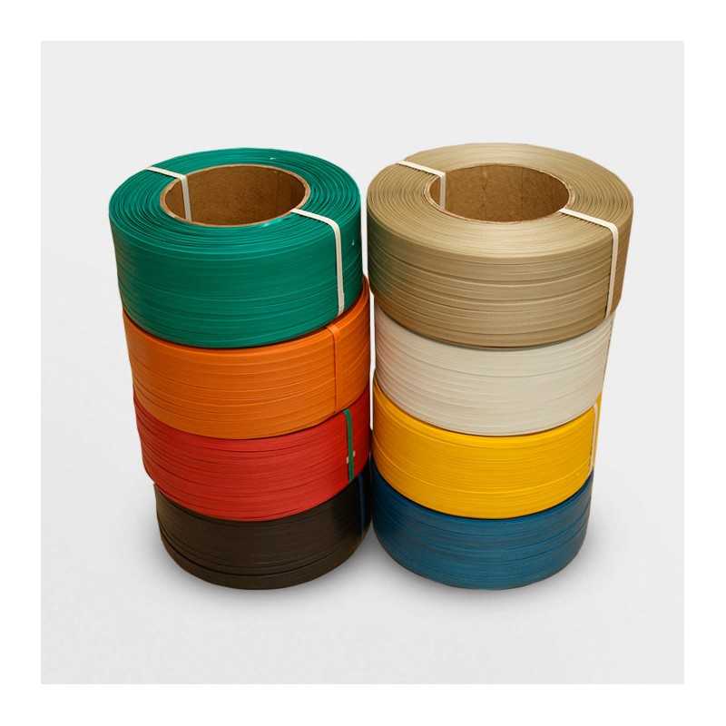 Zuncho plástico x 500 mts en color amarillo, negro, azul, rojo o verde + paquete de 1 Kg de grapas PET x 240 unidades aproximadamente.